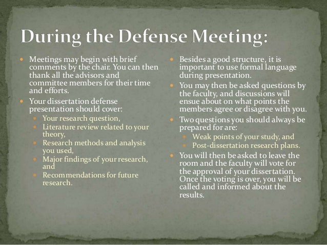The first step is to be ready and get some practice. The second step is to do reconnaissance on your committee. Step 3: Anticipate Events That Are Not Yet Known. The fourth step is to project an air of professionalism and assurance. Step 5: Obtain Some Rest! The sixth step is to relax since you are the expert Organizing and presenting the outcomes of your work critically, convincingly, and articulately, following all the guidelines on how to format your essay Oliver Jones The length of a dissertation varies between study level and country, but is generally around 10,, words at undergraduate level, 15,, words at master’s level and up to 50, words · How do I pass my dissertation defense? Here are a few tips on how to prepare for your thesis defense. Anticipate questions and prepare for them. We’ve mentioned it before but you can really prepare for most of the questions you will be asked. Dress for success. Delegate. Have a backup plan. What to do when you don’t know the answer